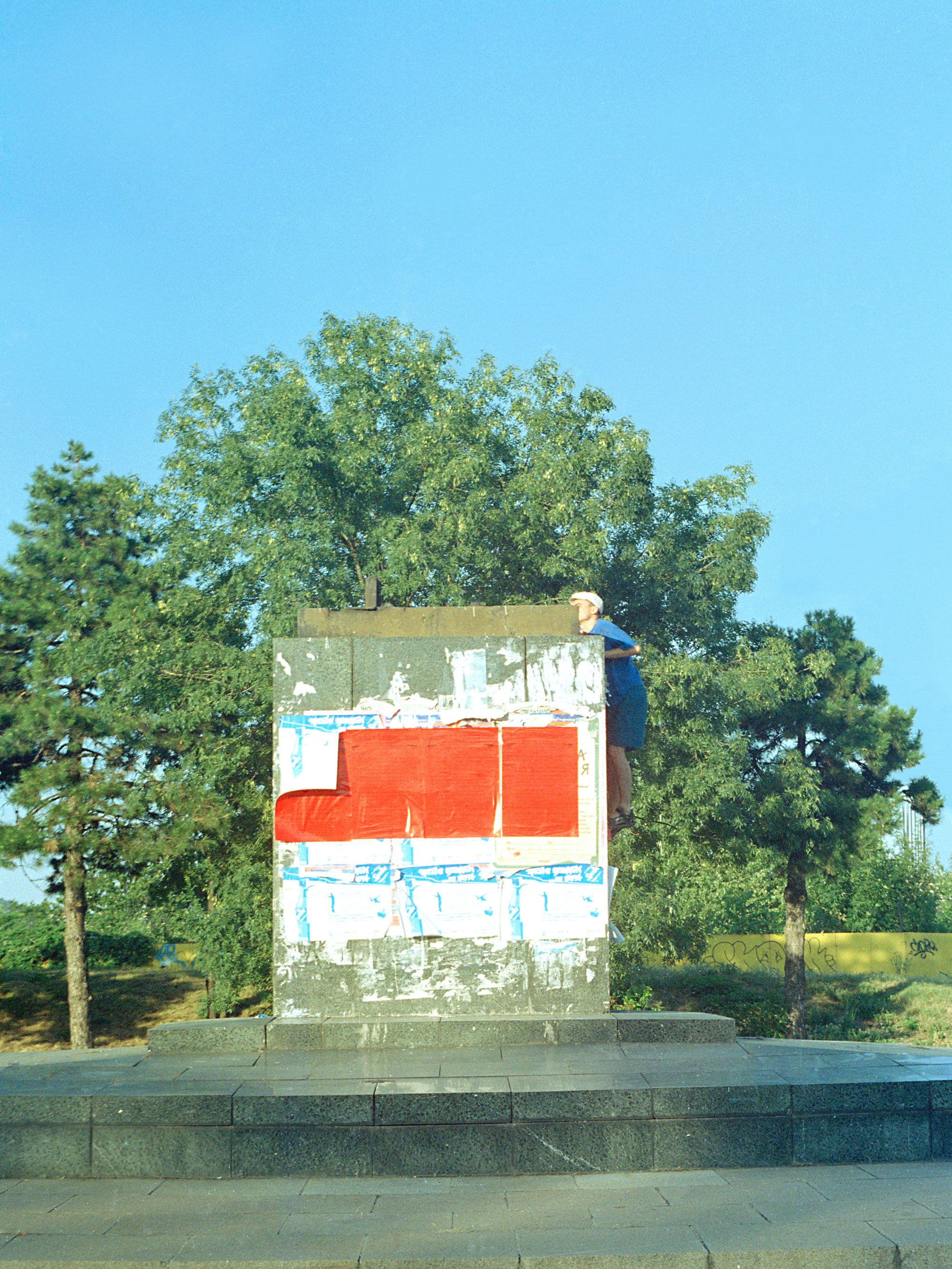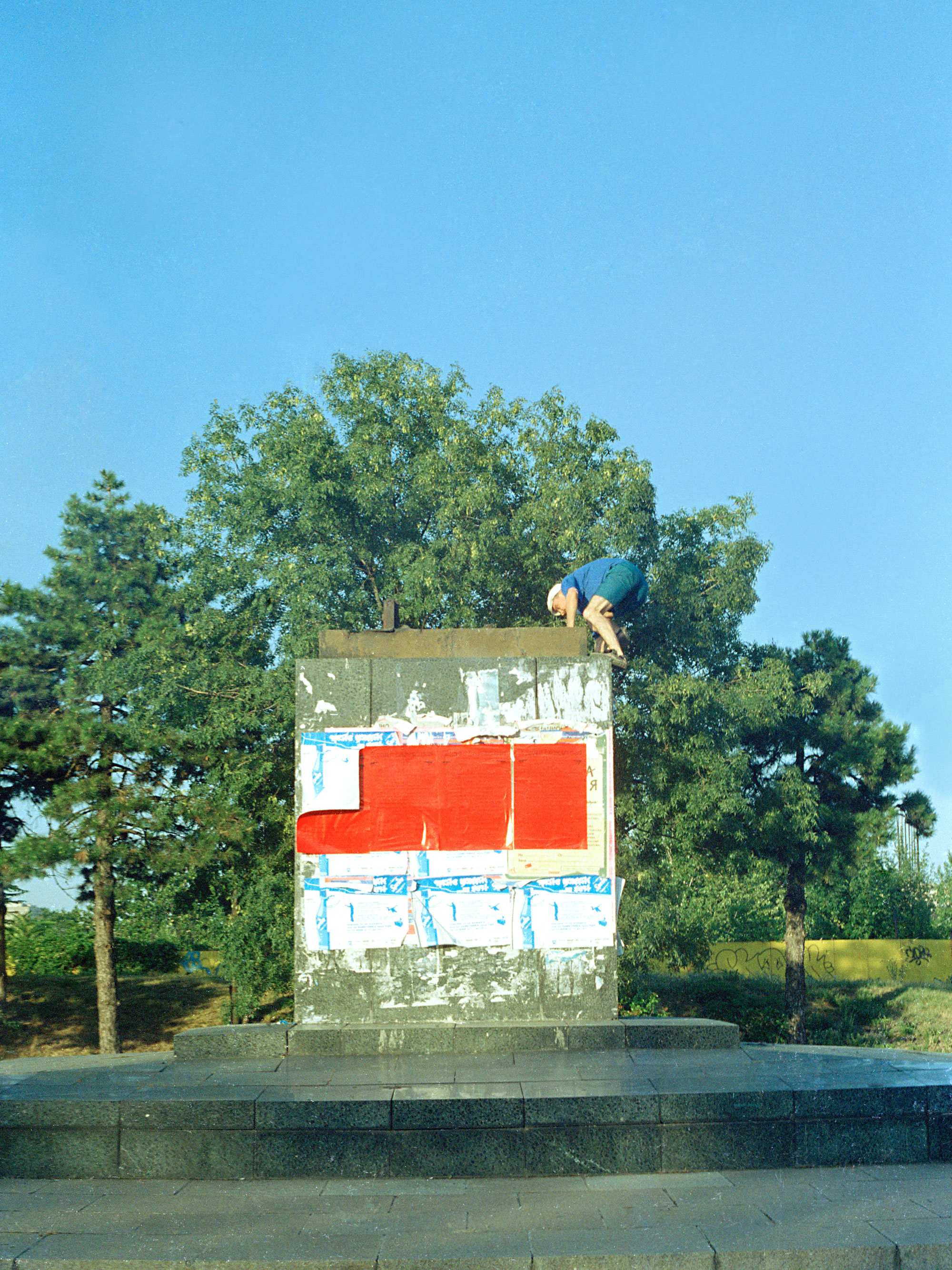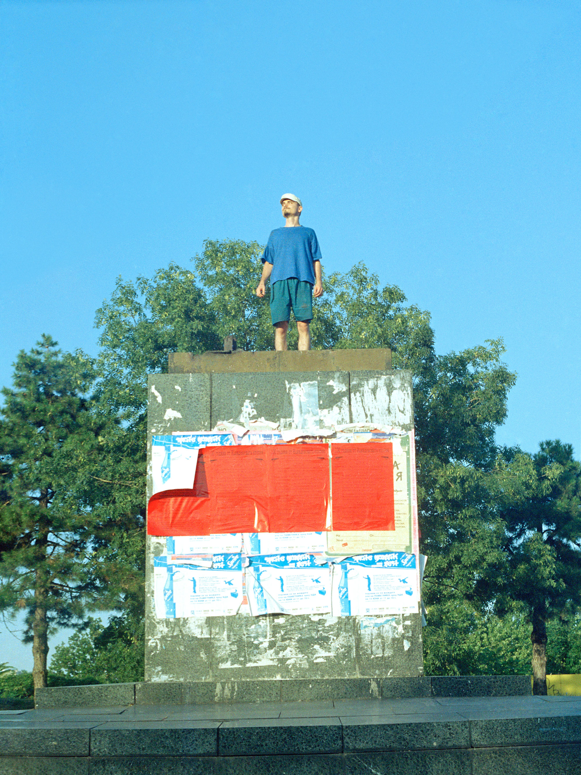 The series of photographs Hello Lenin is a documentation of a performance I did in my hometown Rousse in Bulgaria in the summer of 2003. You see me climbing on an empty pedestal, whose statue had been removed 13 years ago. Formerly, the statue of Lenin was placed here. I wanted to demonstrate how the statue had disappeared but not its ideology; it has just been replaced by a new one.